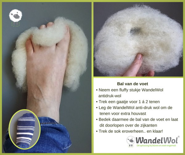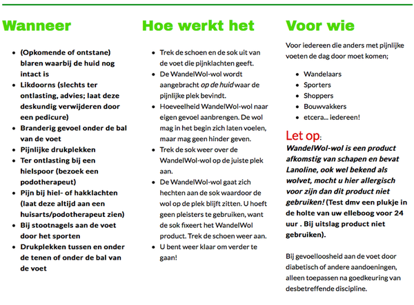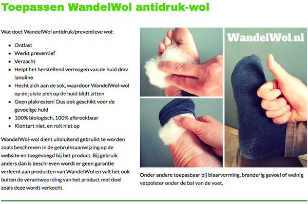 WandelWol antidruk-producten zijn geschikt voor wandelaars, sporters, shoppers en mensen met weinig vetpolster onder de voet, koude voeten, pijnlijke likdoorns tussen of rondom de tenen, wintertenen, hielspoor en bij branderig gevoel onder de bal van de voet. Ter voorkoming van traumanagels bij het sporten of bij lange afstandswandelingen.